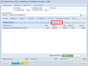 Após adicionar a nota por vendas outras saídas ou se for uma transferência em Compras.Entradas/Transferências, adicione o(s) produtos através do botão “Adicionar”